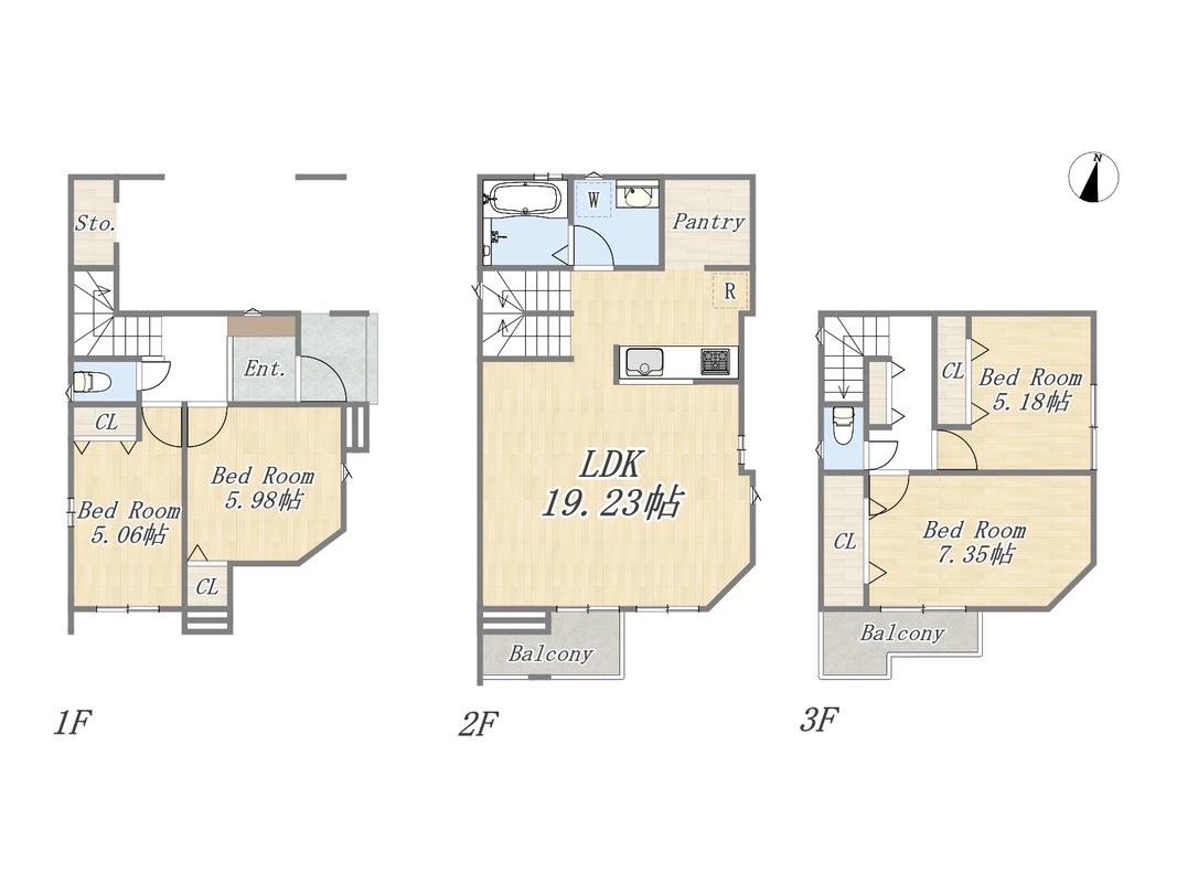 南東角地に位置しており、3階建てで陽当たり・通風も良好!WICやパントリーなど州のも豊富で全棟LDK16帖超×4部屋のファミリープラン!