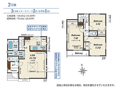 | 建物面積 | 79.49m2~90.62m2 | 土地面積 | 106.19m2~113.33m2 |