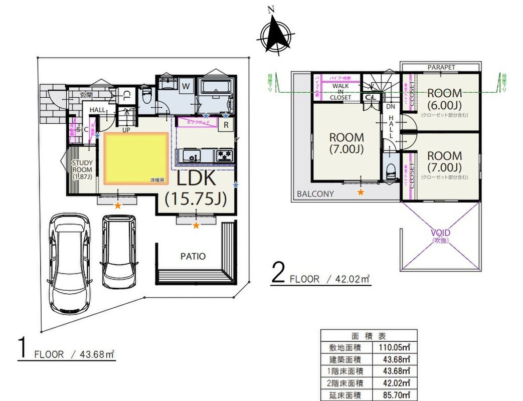 | 駐車場 | 駐車2台可(車種による) | 道路の幅員 | 北側、南側、西側4.5m |