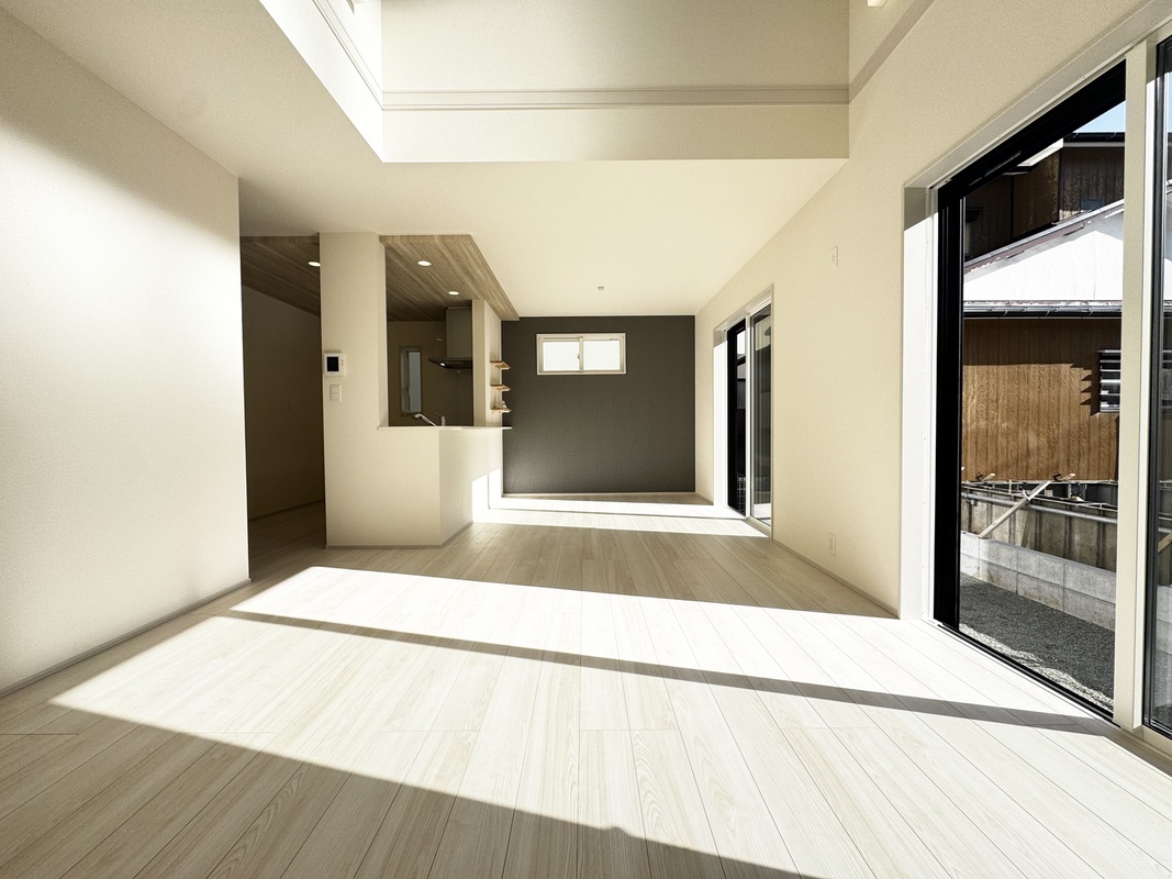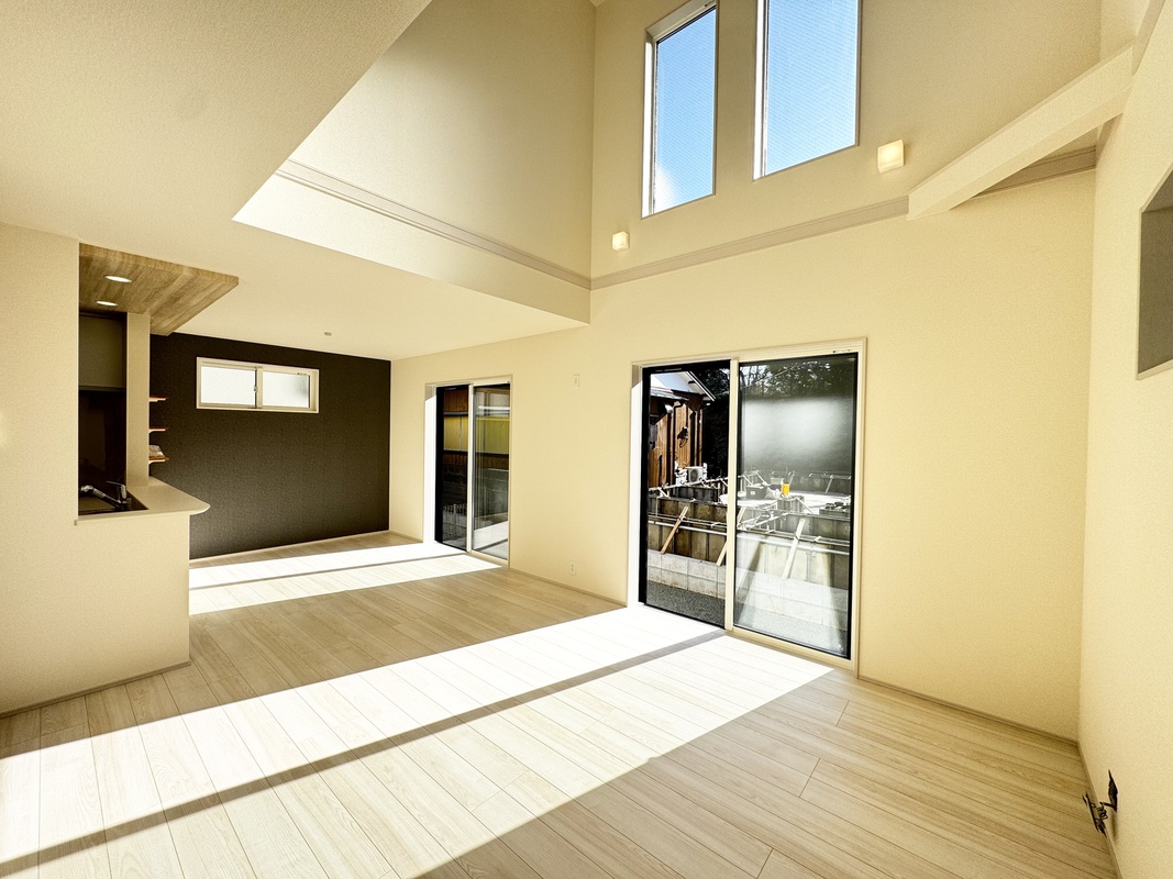 ■20帖超のリビングは、吹抜けを採用した伸びやかな空間設計。上質な開放感と採光に包まれ、ワンランク上の住まい心地を演出します。(1号棟)