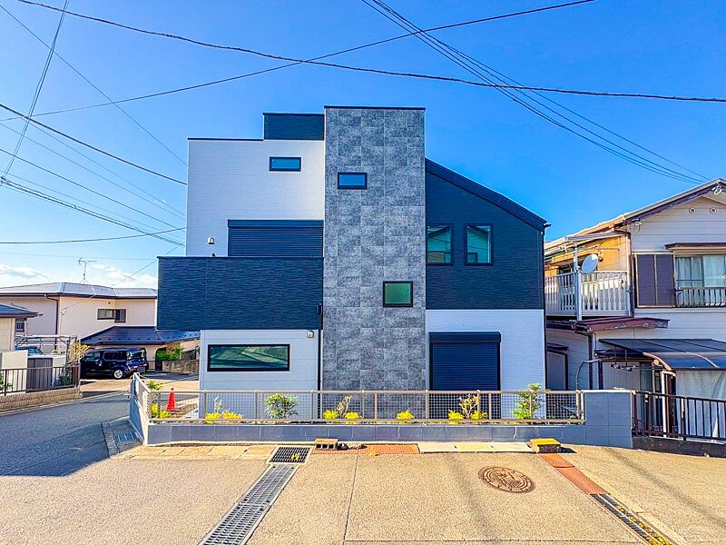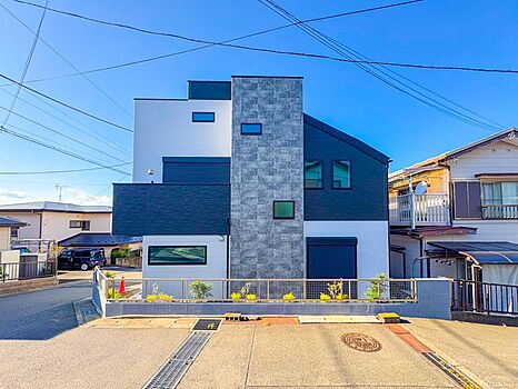 新築一戸建て ◆駅徒歩15分、ロフト付き!閑静な住宅街に角地の陽当たりと開放感!洗練されたモダンな印象のモノトーンの外観は高級感と清潔感をあわせもった新邸です!