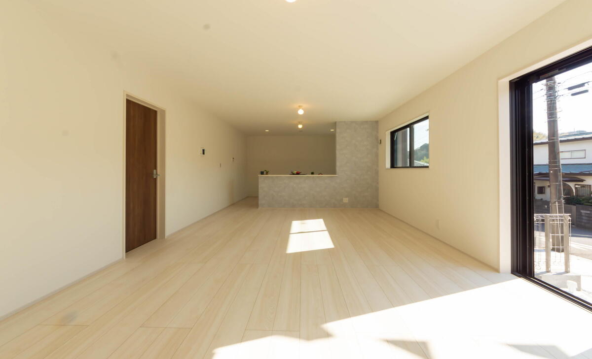 陽光降り注ぐ18帖のLDK:広々としたリビングは、南向きで日当たりも良好。家族の会話が弾む対面式のカウンターキッチンからは、リビング全体を見渡せます