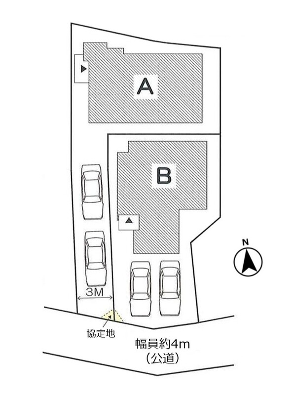 | 駐車場 | 2台 | 道路の幅員 | 南側4m(B棟セットバック0.44m2有) |