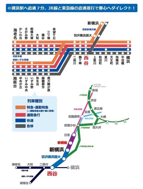 相鉄本線「西谷」駅 徒歩14分 JR横浜線「鴨居」駅 バス13分「富士見橋」停 徒歩3分 JR東海道本線「横浜」駅 バス22分「富士見橋」停 徒歩3分 |