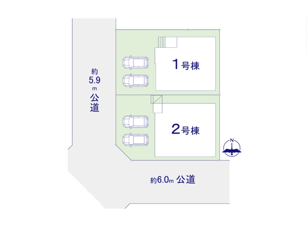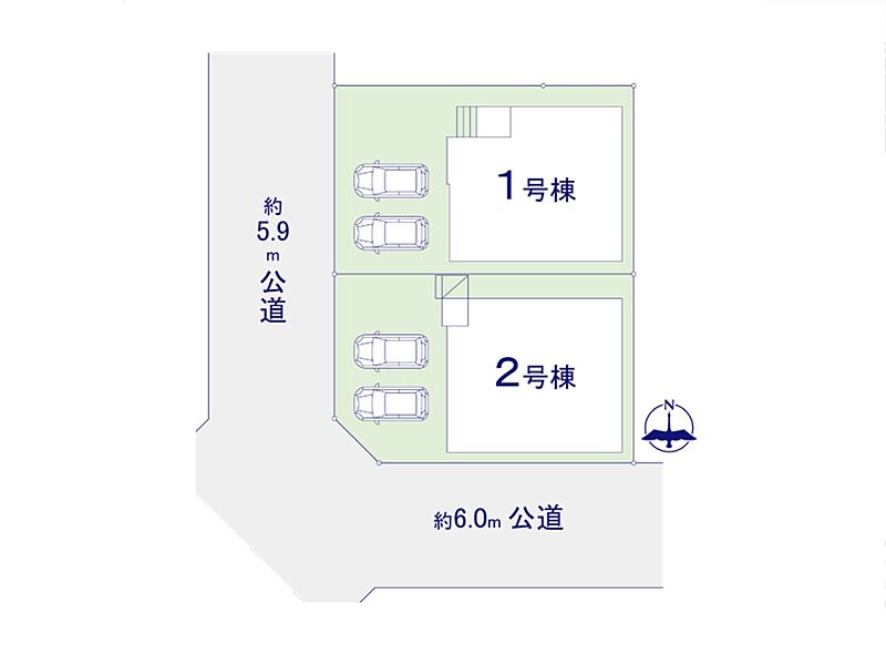 | 駐車場 | 2台 | 道路の幅員 | 1号棟:西5.9m /2号棟:南6m 西5.9m |
