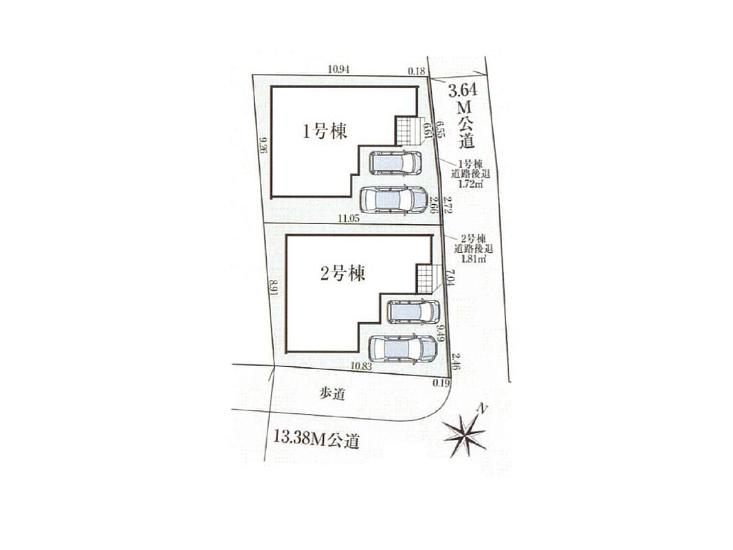 | 駐車場 | 2台 | 道路の幅員 | 2号棟:南東13.3m 北東3.8m |