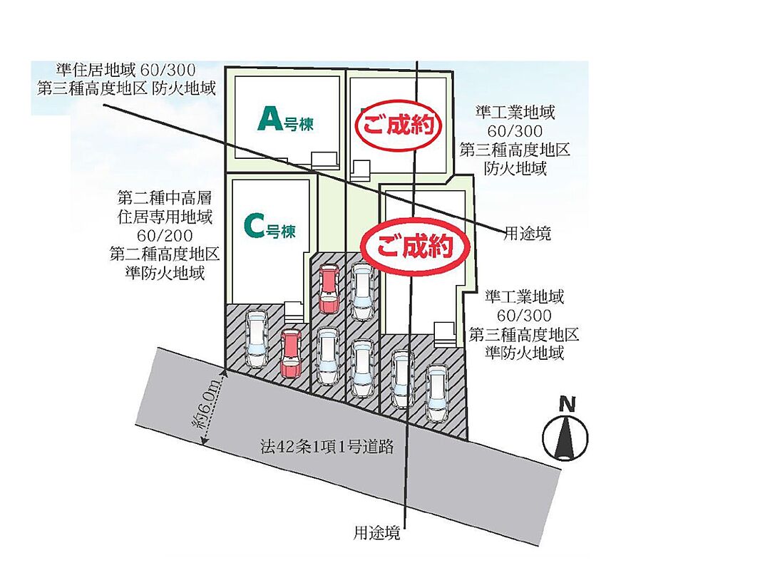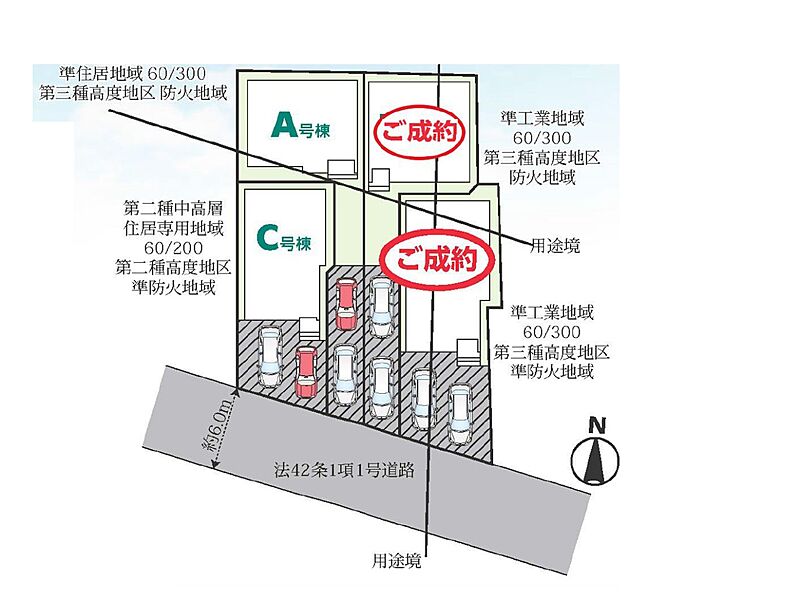 | 駐車場 | 2台 | 道路の幅員 | A号棟:南6m |