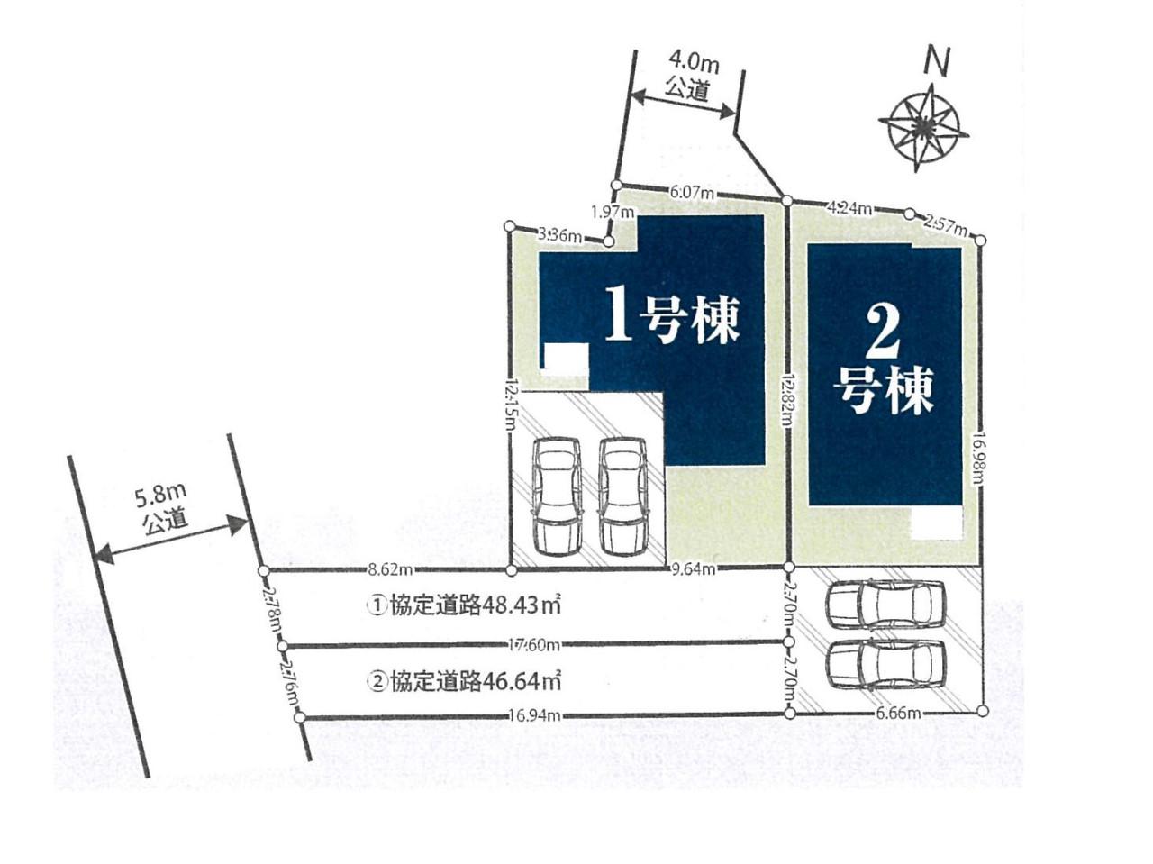 | 駐車場 | 2台 | 道路の幅員 | 2号棟:南東5.8m /1号棟:南東5.8m |