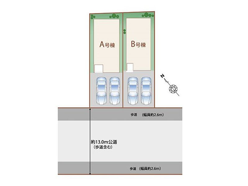 | 駐車場 | 2台 | 道路の幅員 | A号棟:南西13m /B号棟:南西13m |