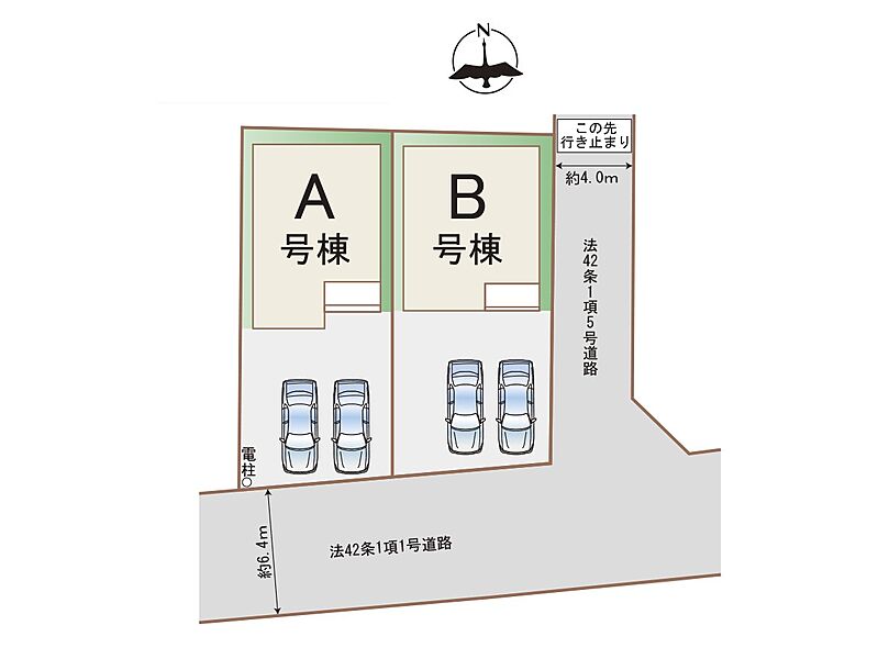 | 駐車場 | 2台 | 道路の幅員 | A号棟:南6.4m /B号棟:南6.4m 東4m |