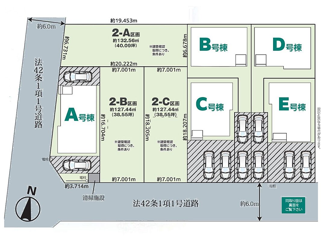 | 駐車場 | 2台 | 道路の幅員 | 1~A号棟:南6m 西6m /1~D号棟:南6m /1~B号棟:南6m /1~E号棟:南6m |