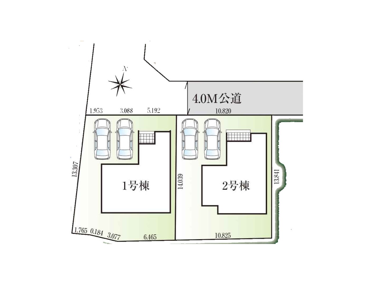 | 駐車場 | 2台 | 道路の幅員 | 1号棟:北4m /2号棟:北4m |