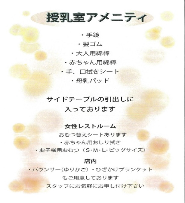 落ち着いてご相談できるようにおもちゃが豊富なキッズスペース、ベビーベット、授乳室も完備!紙おむつも常備しておりますので小さなお子様連れのお客様も安心してご利用くださいませ。
