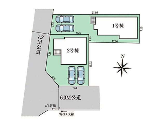 | 駐車場 | 2台 | 道路の幅員 | 2号棟:西7.2m 南6m /1号棟:西7.2m |