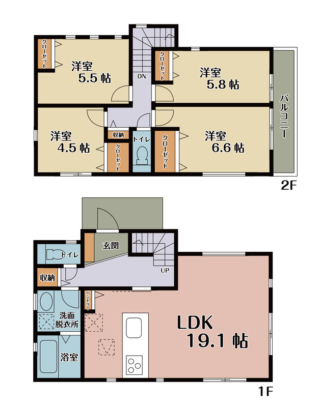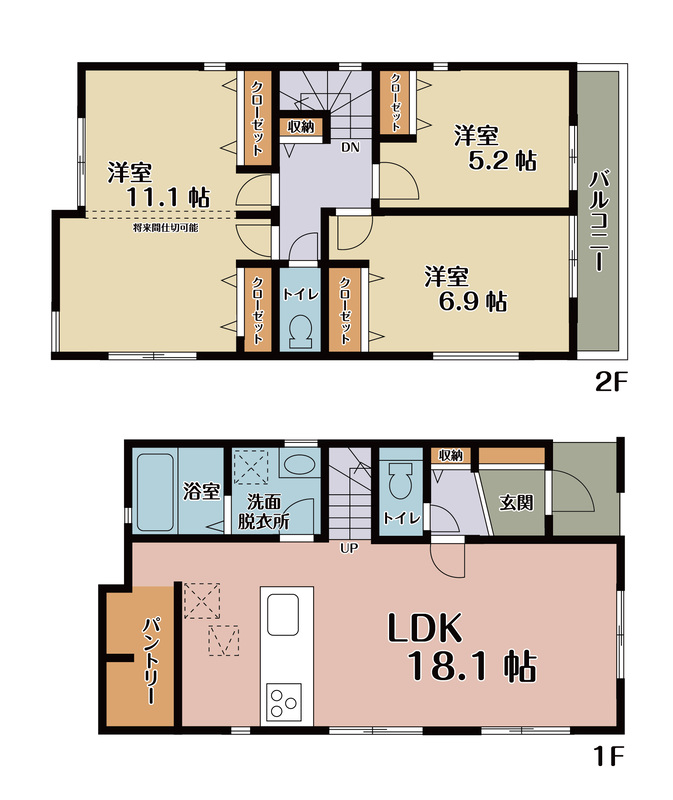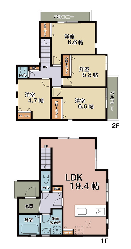 | 建物面積 | 96.5m2(5号棟)~98.95m2(3号棟) | 土地面積 | 100.11m2(1号棟)~127.83m2(3号棟) |