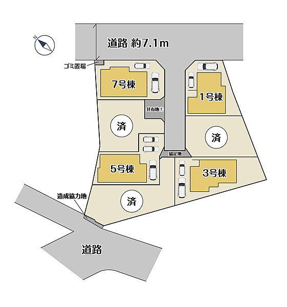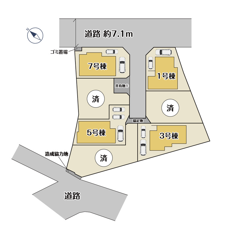 【現地見学会】 (直接現地へご来場ください) 日程/毎週土日祝 時間/11:00~17:00 ※建築中のため、事前にご連絡をいただけるとよりスムーズにご案内させていただけます。 (上記日程外・時間外でも見学可能です。※その場合は事前に必ずお問合せ下さい。) カーナビ設定:横須賀市池田町5-7-2 付近 現地ではスタッフが待機しておりますので、【 事前連絡なし 】でご来場いただけます! 皆様のご来場を心よりお待ちしております。 私道:81.70m2.持分7分の1、共有地:17.51m2.持分5分の1(2~6号棟)、ゴミ置場:1.57m2.持分7分の1、共有地(2)部分に覚書有(2~5号棟) |