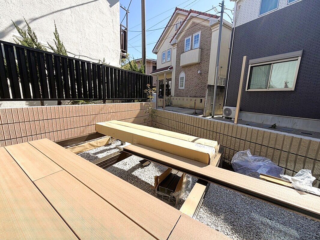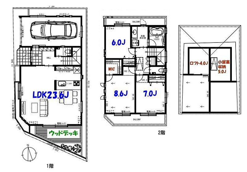 南西角地 1階LDK ウッドデッキ付き。物件ポイント・電動防火シャッターガレージ・耐震等級2・ロフト4帖・小屋裏収納5帖。