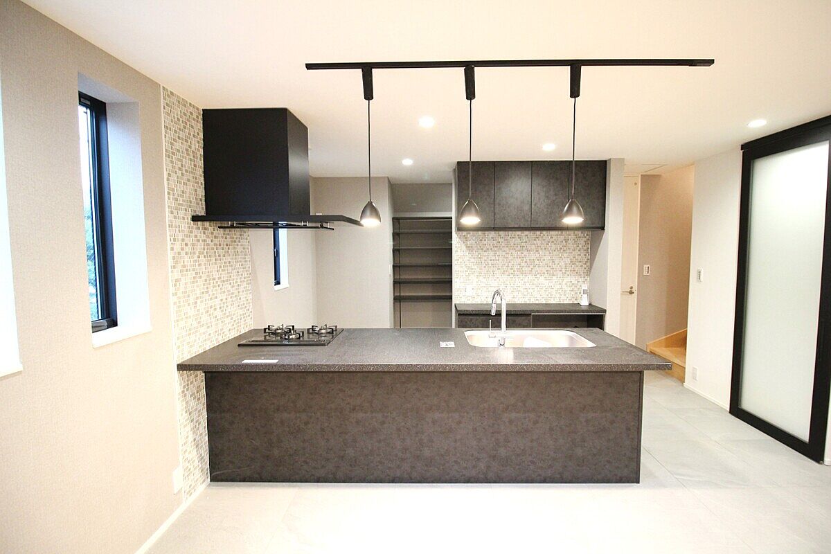 【キッチン】対面式キッチン。料理しながらリビングにいる家族の様子を見れます。パントリー・カップボード・ガスオーブンレンジ付【通学域】市谷小学校・牛込第三中学校