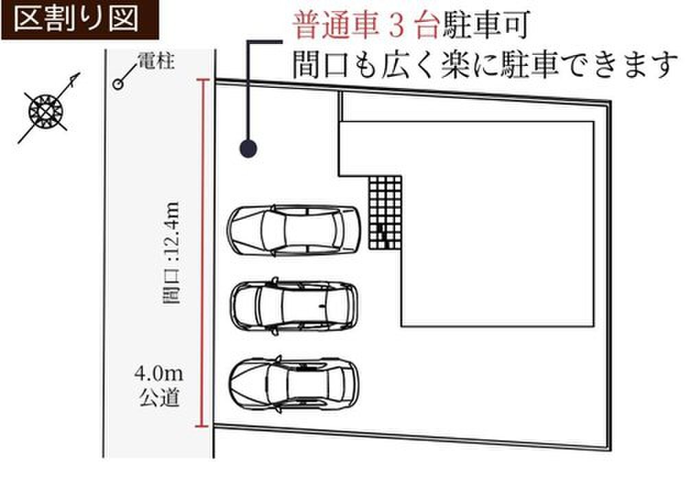 | 駐車場 | 3台 | 道路の幅員 | 道路幅:4m、アスファルト舗装、南西 4m 公道 |