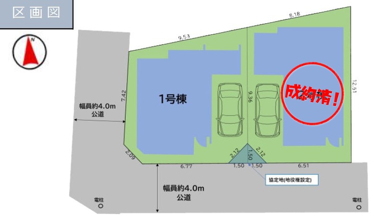 | 駐車場 | 1台 | 道路の幅員 | 道路幅:4m、アスファルト舗装、南 4m 公道、西 4m 公道 |