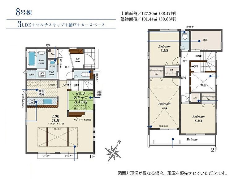 8号棟 間取り 3LDK+S 価格 4680万円 建物面積 101.44m2 土地面積 127.2m2 -