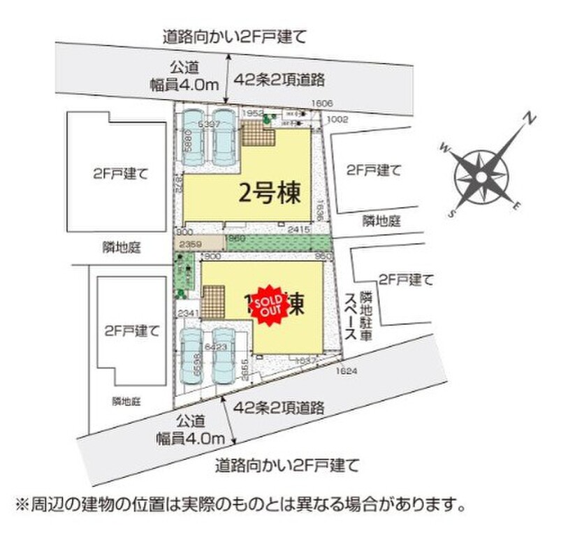 | 駐車場 | 2台 | 道路の幅員 | 道路幅:4m、アスファルト舗装、南東4.0m公道、北西4.0m公道 |