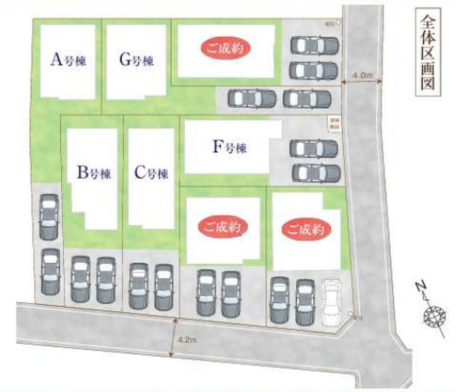 | 駐車場 | 2台(A・B・C・F・G号棟(2台)) | 道路の幅員 | 道路幅:4m、アスファルト舗装、東側約4m 公道、南側約4m 公道 |