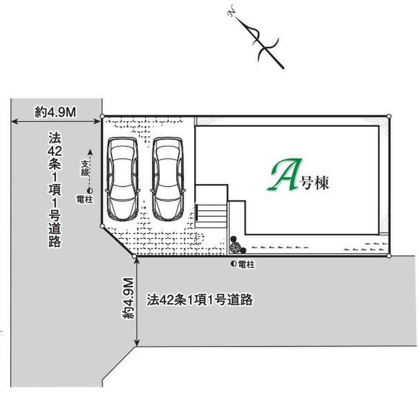 | 駐車場 | 2台 | 道路の幅員 | 道路幅:4.9m、アスファルト舗装、北西 4.9m 公道、南西 4.9m 公道 |