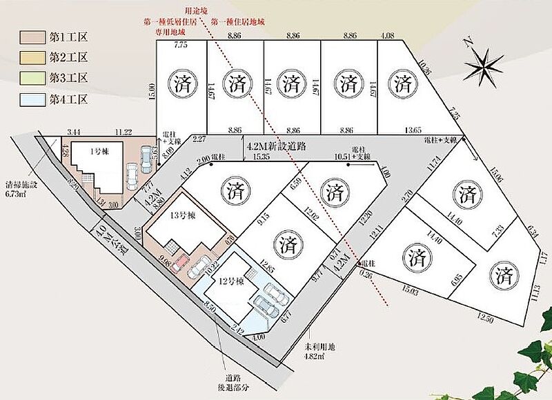 全14棟、収納たっぷり個性豊かな魅力溢れるプラン!きっとお好みの間取りに出会えます。同じ時期に生活をスタートさせるご家族の多い分譲地は、困ったときも心強い♪ゆとりの敷地39坪超え!車2台可!