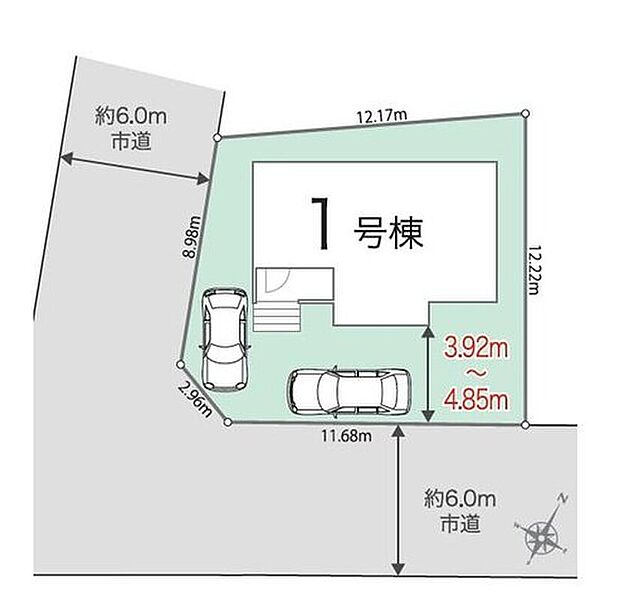 | 駐車場 | 2台 | 道路の幅員 | 道路幅:6m、アスファルト舗装、西側約6.0m 市道、南側約6.0m 市道 |