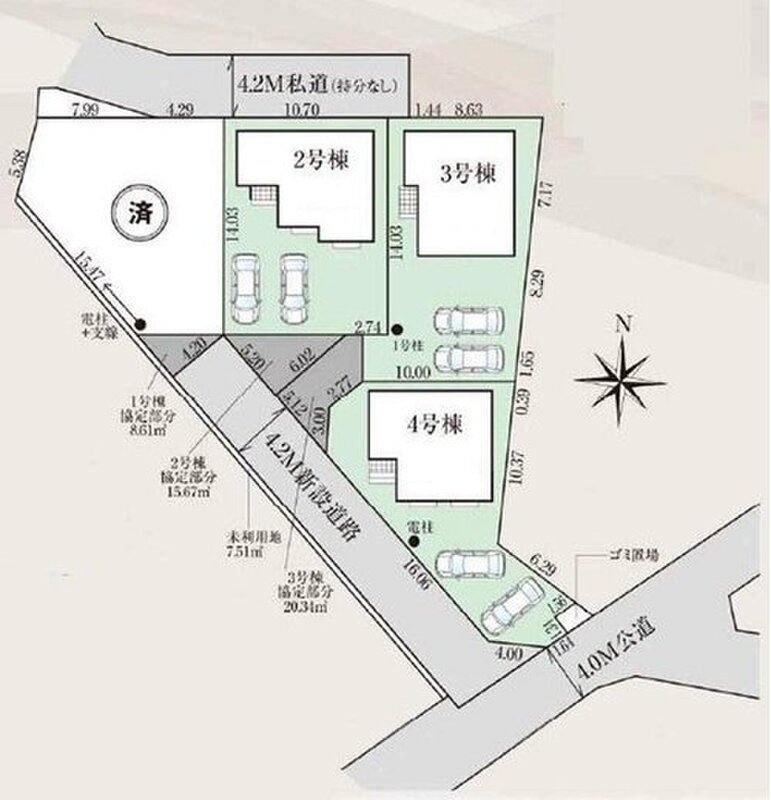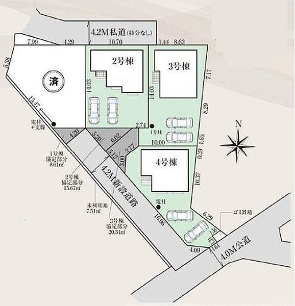 | 駐車場 | 2台 | 道路の幅員 | 道路幅:4m~4.2m、アスファルト舗装、南東側4.0m 公道、北側4.2m 私道、分譲地内4.2m |