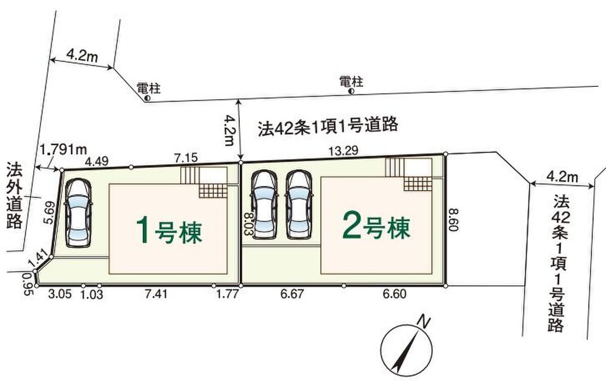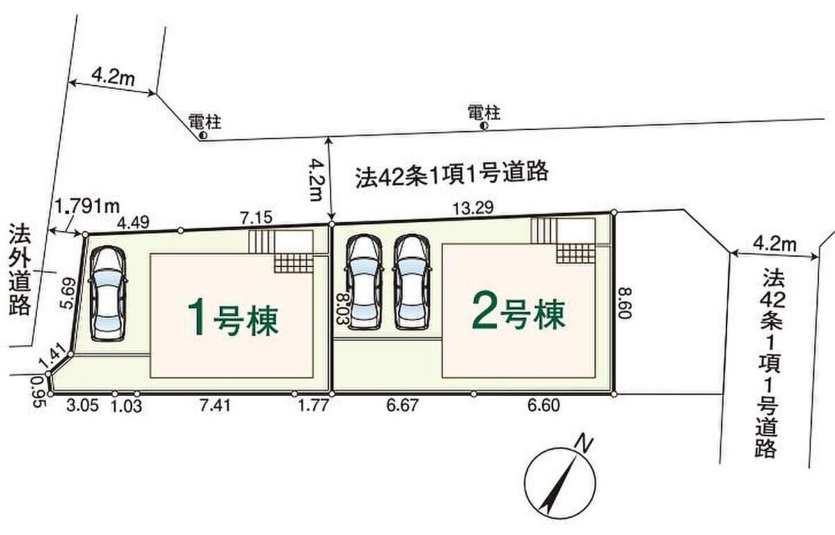| 駐車場 | 1台 ~ 2台(1号棟(1台)、2号棟(2台)) | 道路の幅員 | 道路幅:4.2m、アスファルト舗装、北西側 約4.2m 公道 |