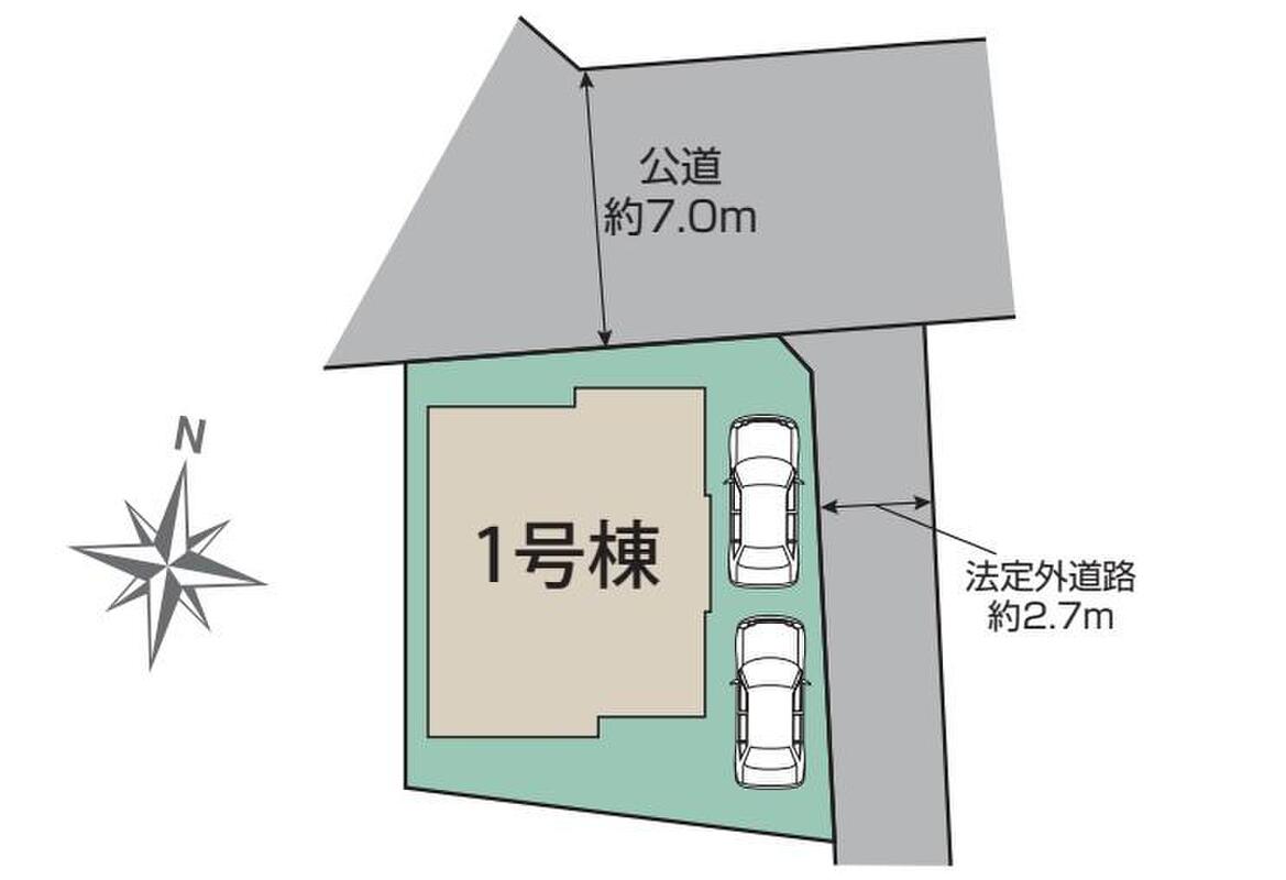 | 駐車場 | 2台(車種による) | 道路の幅員 | 道路幅:7m、アスファルト舗装、北 7m 公道 |