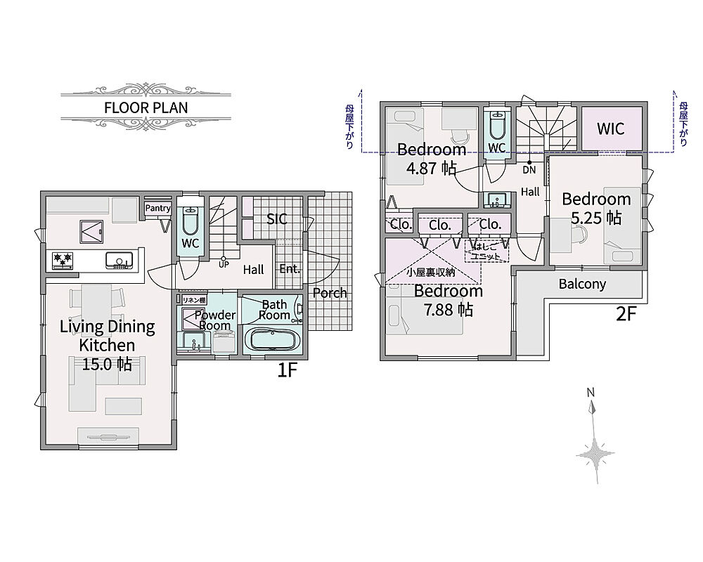 - SICやWIC、パントリー、リネン棚などの収納スペースを豊富に備えた3LDK+小屋裏収納で快適にお住まいいただけます。