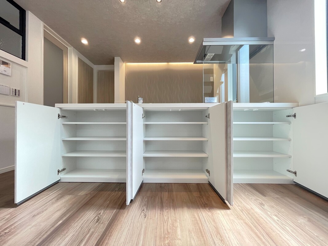 ■ペニンシュラキッチンの前面収納(背面側)をご家族分のパジャマやインナー等の収納場所にすれば浴室へ向かう時にサッと取り出せて便利!