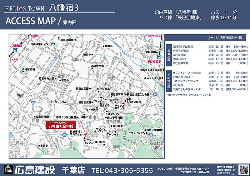 JR内房線「八幡宿」駅 バス11分 辰巳団地東バス停 徒歩13分~14分 京成千原線「ちはら台」駅 徒歩52分~53分 |