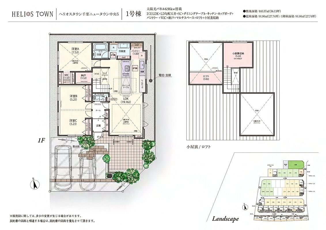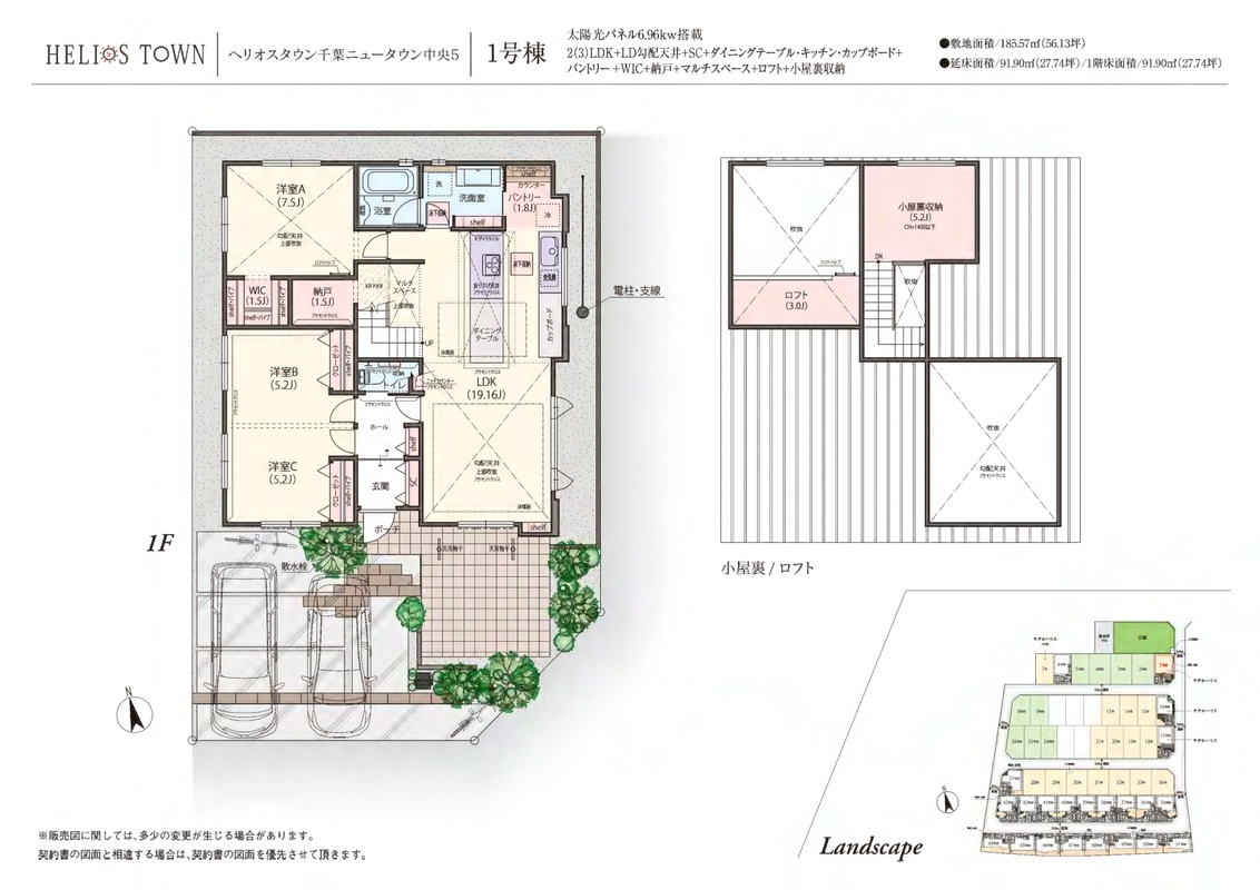 1号棟 間取り 2(3)LDK 価格 4990万円 建物面積 91.90m2 土地面積 185.57m2 -