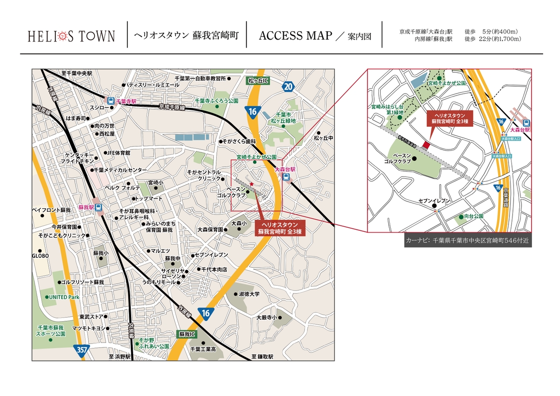 JR京葉線「蘇我」駅 徒歩18分 京成千原線「大森台」駅 徒歩5分 京成千原線「千葉寺」駅 徒歩24分 |