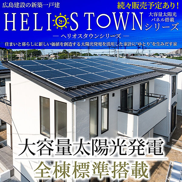 大型太陽光パネル付き、ZEH仕様住宅。床暖房や乾太くん付きの充実の設備仕様