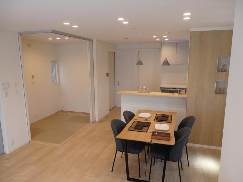 ■ゆったりLDK:LDK+タタミコーナーで20帖超え。タタミコーナーにはL字型に扉があるので、広々使いたいとき・小部屋として使いたいとき、用途に合わせられます。