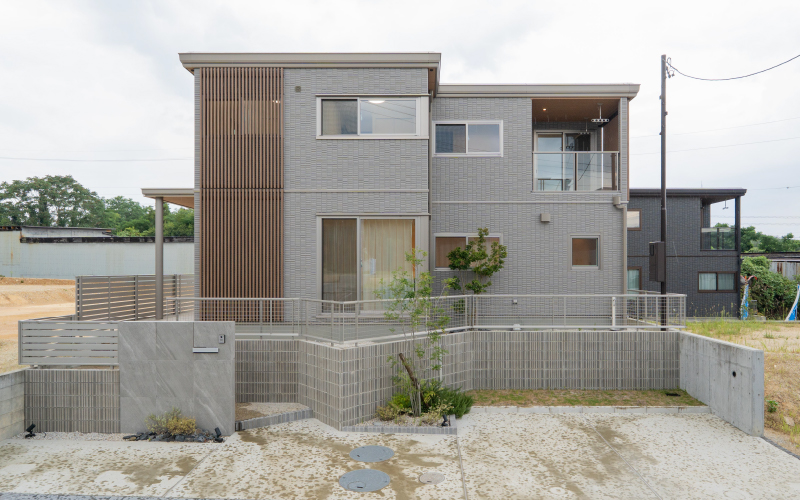 高級感溢れるグレーの外壁と木目調の格子がアクセントのアーバンシックスタイル。駐車は3台可能。南にはLDKから見える庭があるのでガーデニング好きの方にもおすすめです。