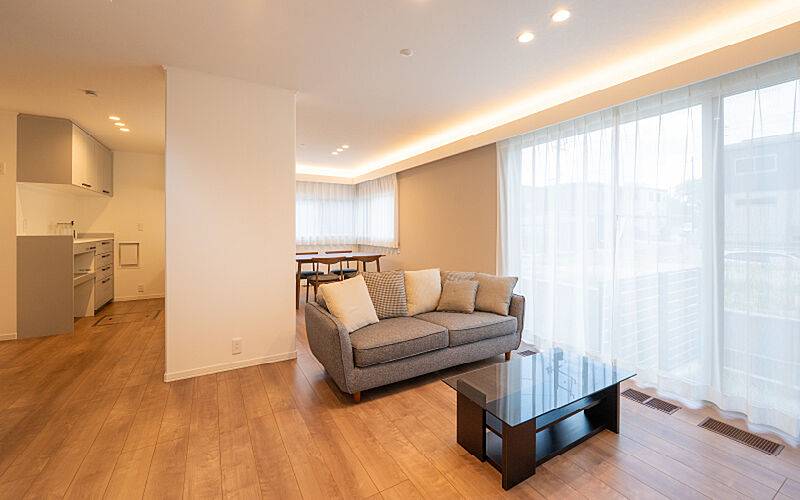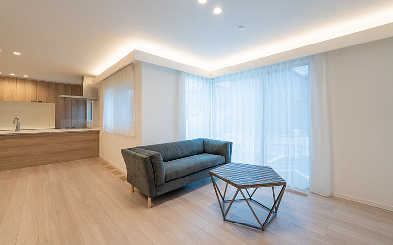 20畳以上あるLDKは大きなソファを置いてもゆとりある広さ。南面の大きな窓からたっぷりと光が室内に行き届きます。夜には窓上にあるコーブ照明が優しい光を届けてくれます。