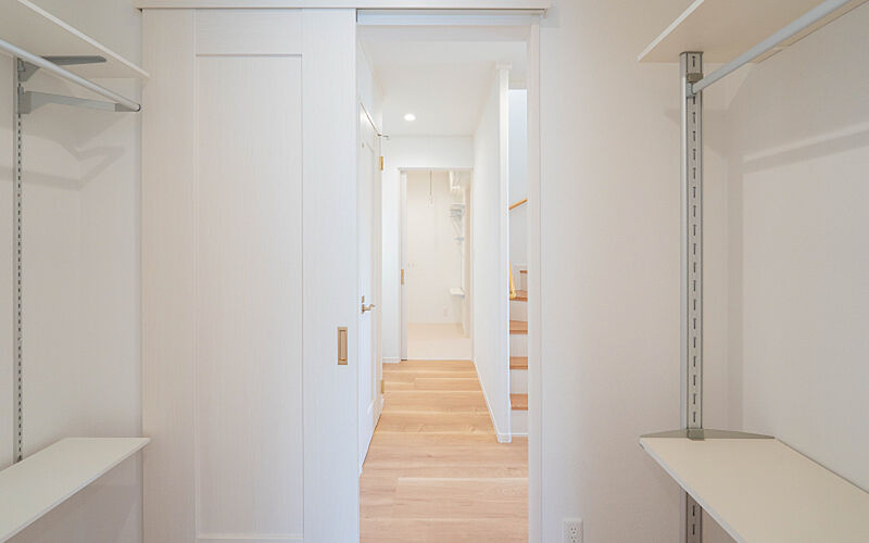 外観・内装ともに落ち着いた大人のデザインが魅力の木造住宅です。デザインだけでなく、1階に設置された大容量W.I.Cは収納量バッチリで、隣接のサンルームで室内干しも楽々です♪