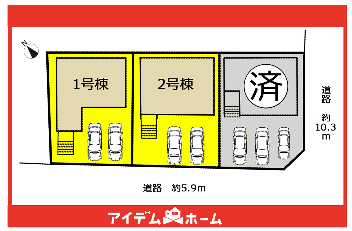 | 駐車場 | 2台 | 道路の幅員 | 南西側5.9m、南東側10.4m公道 |
