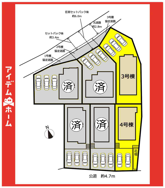 | 駐車場 | 2台 ~ 3台 | 道路の幅員 | 北側2.8m公道、南側4.7m公道 |