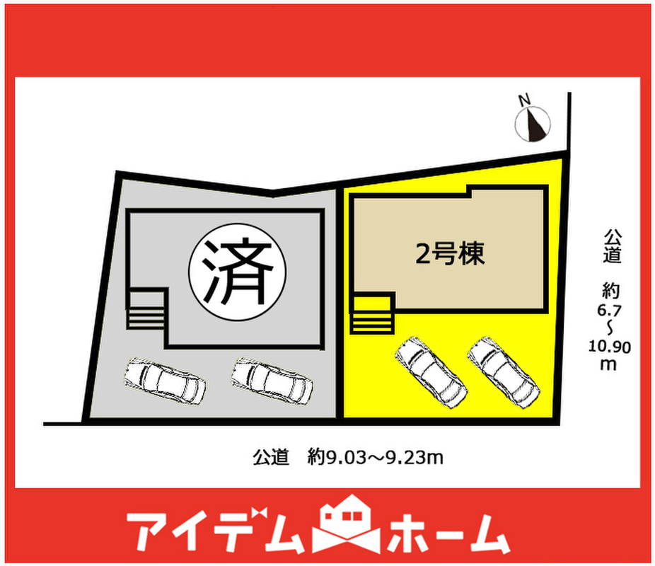 | 駐車場 | 2台 | 道路の幅員 | 東側約6.7m~10.90m、南側約9.03~9.23m(公道) |