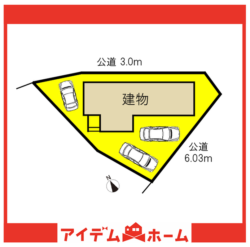 | 駐車場 | 3台 | 道路の幅員 | 接道1:南東 幅員6.03m、接道2:北 幅員3.0m |