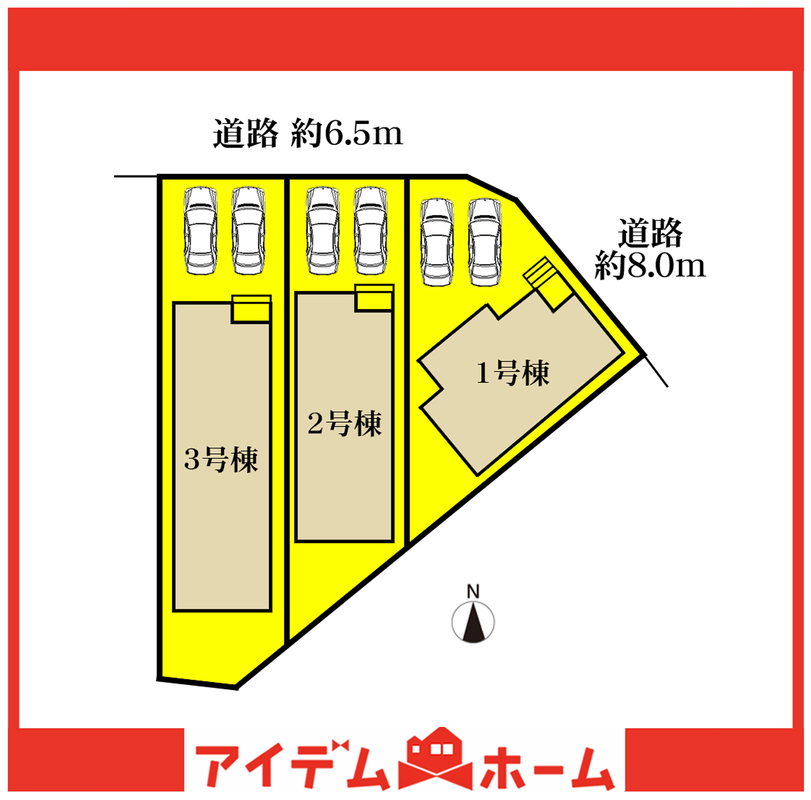 | 駐車場 | 2台 | 道路の幅員 | 接道1:北 幅員6.5m、接道2:北東 幅員8.0m |