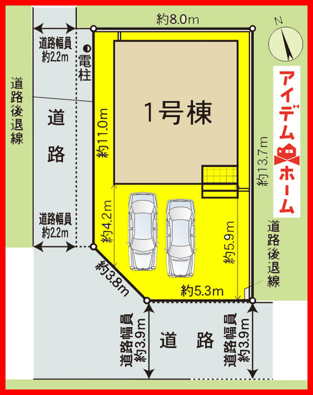 | 駐車場 | 2台(駐車2台可能なカースペース) | 道路の幅員 | 南側 3.97m 角地 公道、西側 2.21m 角地 公道 |