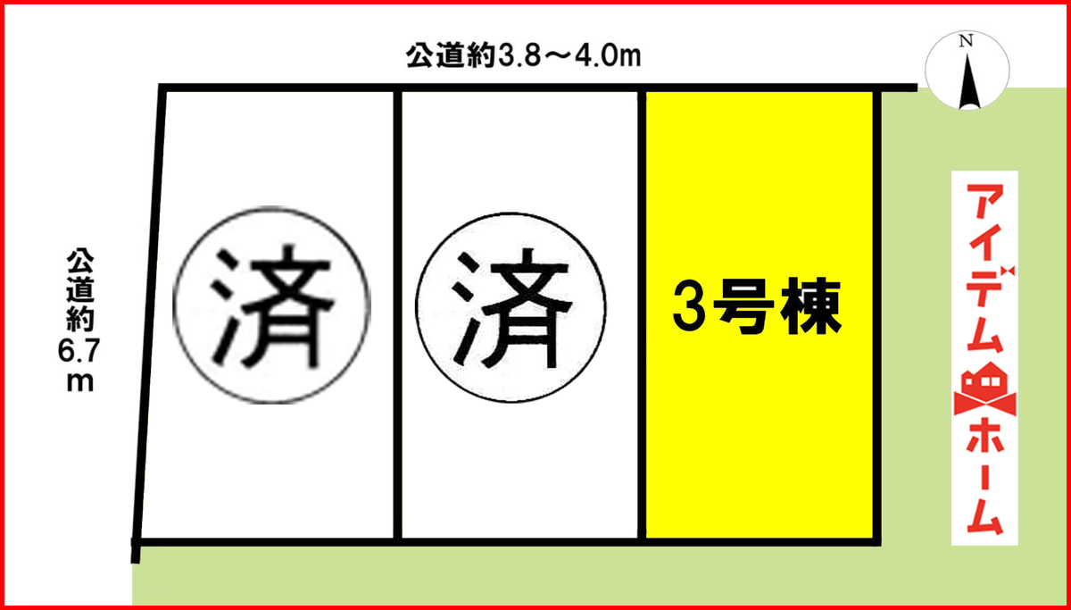 | 駐車場 | 駐車2台可能なカースペース | 道路の幅員 | 北側4.0m、西側6.7m |